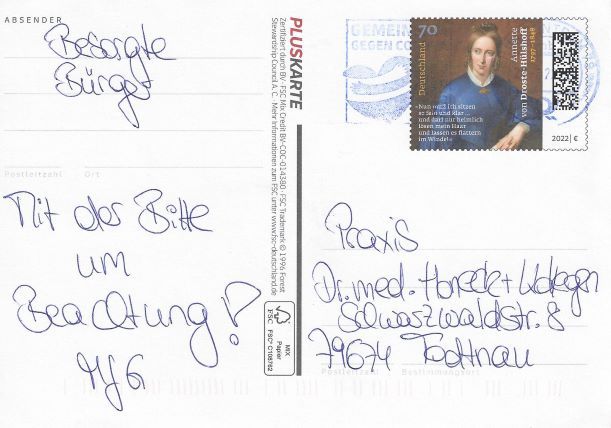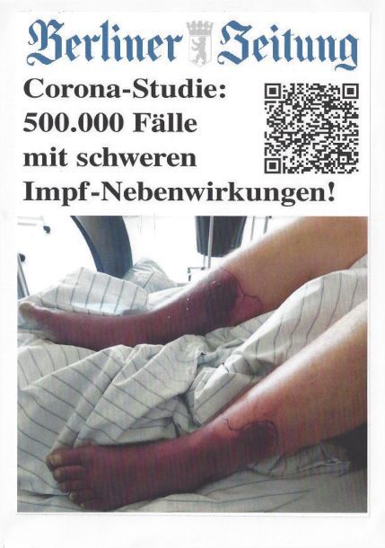 Geschmacklos ist diese Postkarte, da das Bild nicht aus dem Artikel der Berliner Zeitung stammt, sondern ein sog. Waterhouse-Friderichsen-Syndrom zeigt, eine Komplikation einer Sepsis durch Meningokokken, die man erleiden kann, wenn man NICHT dagegen geimpft ist. Man würde gerne den Absendern "Besorgte Bürger" antworten mit einem Verweis auf einen ebenso reißerisch verfassten Artikel https://www.rtl.de/cms/wegen-fehlender-meningitis-impfung-sophia-verlor-beide-beine-4680348.html , aber auf das Niveau will man sich weder herablassen, noch wüsste man bei einem anonymen Schreiben, an wen man die Antwort richten sollte.